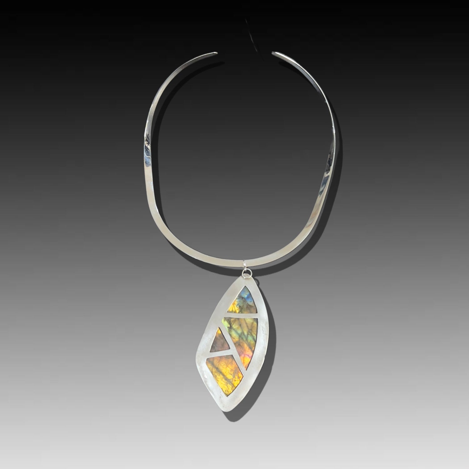 Make an unforgettable entrance with this one-of-a-kind statement necklace. A massive marquise-cut labradorite takes center stage, flashing with fiery gold, green, and hints of red as it catches the light. The stone is set in sterling silver with a clean, modern frame and suspended from a wide, hand-forged silver collar that hugs the neckline beautifully. The rear back of the pendant has cutouts to showcase the flash, in fact, wear it either way!